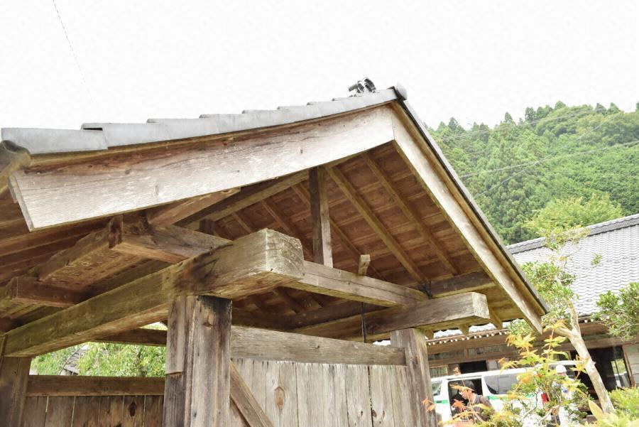 敷地南面中央にあり、敷地南側を流れる水路に架かる石橋を覆うように建つ。桁行、梁間とも一間、切妻造桟瓦葺。正背面の柱間に架ける桁上に梁を渡し、その鼻先で軒桁を、梁中央に立つ束で棟木を受ける。伝統的な農家の表構えを形成している。