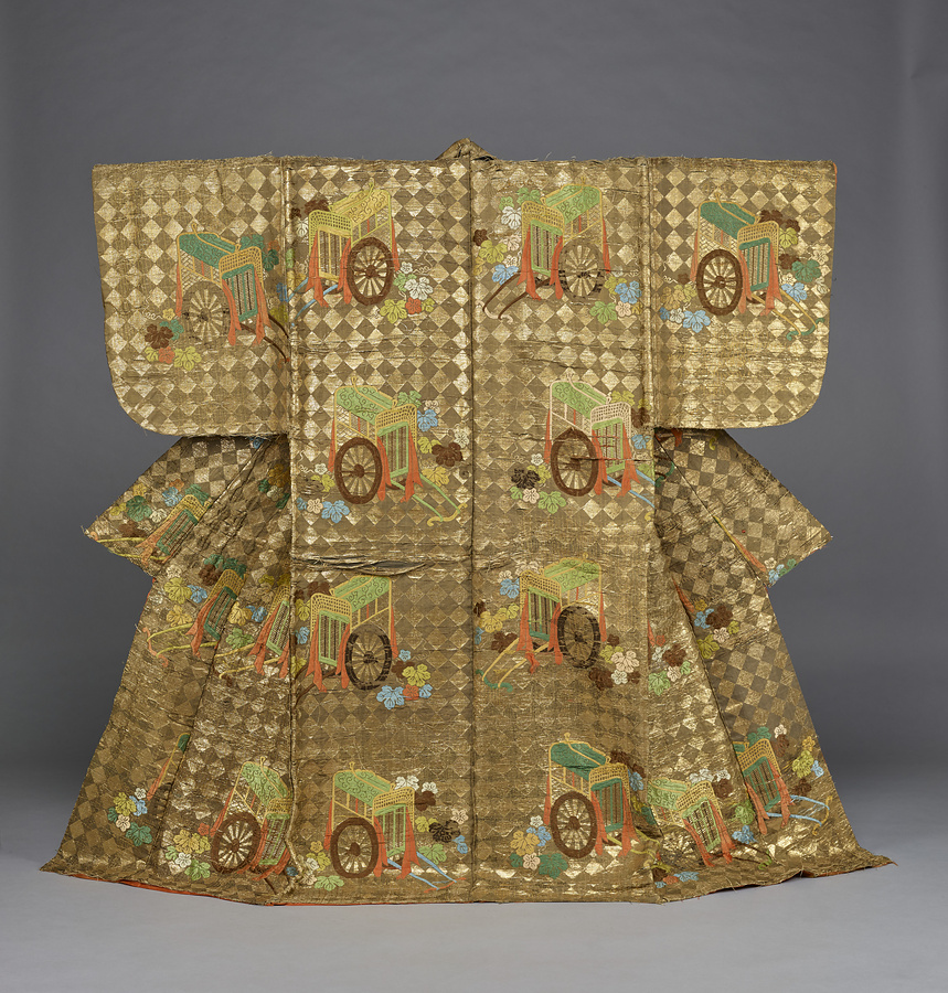 唐織 茶地石畳御所車夕顔模様