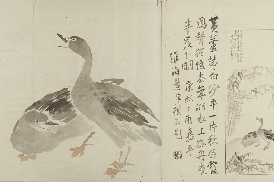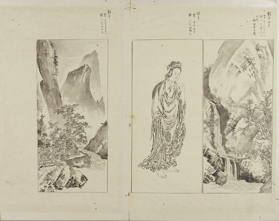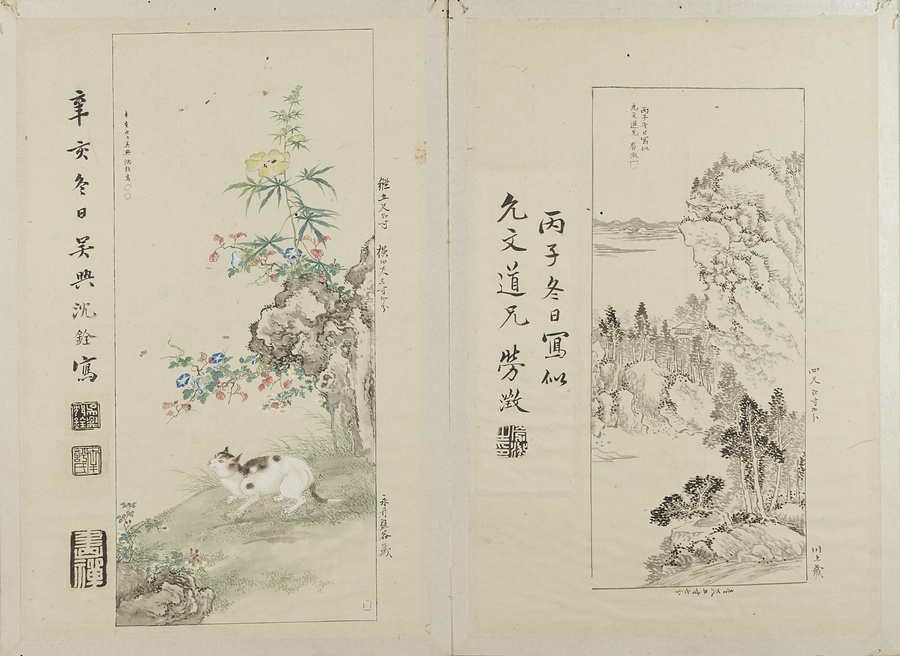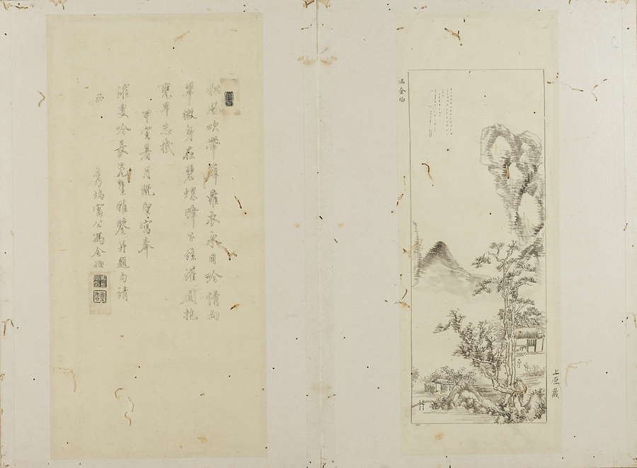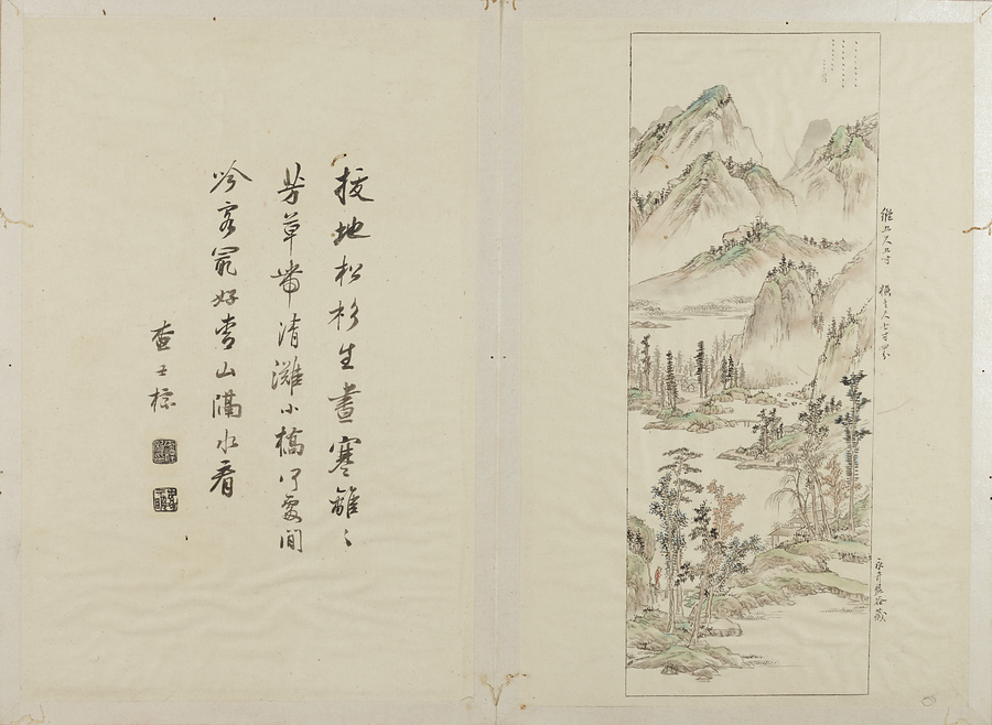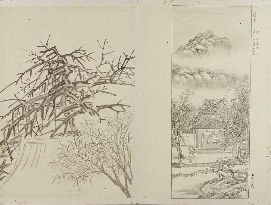 江戸時代までの画人たちは、沈南蘋(しんなんぴん)ら来舶清人(らいはくしんじん)たちから画法を学ぶ一方、さらには、正統文人画に至る画法も模索していました。この図冊は日本に伝来した明清画を写して貼り込んだもので、狩野派が追及した宋元画ではなく、新来の文人画に重きを置いていることに特色があります。