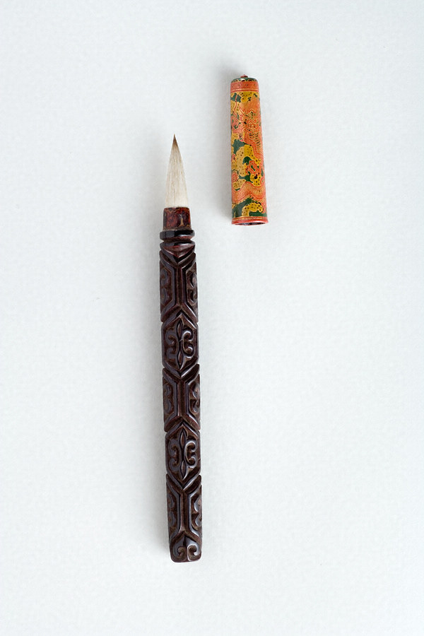 「堆黒」とは、黒漆を何度も塗り重ねて文様を彫刻する技法のこと。文字どおり漆黒の地に、六角形の亀甲文の中にデザイン化された花唐草文様を彫り込んでいるが、終わることなく反復する文様は永遠の象徴とされているため、本筆は吉祥的な意味を備えている。龍が色漆で描かれている筆帽は、趣が異なるため後補と考えられる。艶やかな表面の光沢と、精密な彫技からかもし出される風格は、本コレクションの中でも格別である。