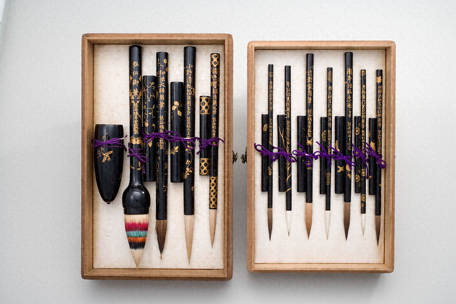 歴史学者、黒板勝美(一八七四~一九四五)が古今の様々な文献を博捜して得た知見をもとに、現存していない日本歴代の書の名人たちの用筆を考証し、江戸時代創業の京都の老舗、鳩居堂の職人の手によって制作されたもの。黒板勝美は東京帝国大学教授、日本古文化研究所所長などを歴任し、『国史大系』の編纂・校訂に尽力した大学者である。「乾」「坤」の二つの桐箱に嵯峨天皇・空海・橘逸勢の「三筆」、小野道風、藤原佐理、藤原行成の「三蹟」、本阿弥光悦、松花堂昭乗、近衞信尹の「寛永の三筆」、そして藤原定家、藤原公任の筆として作られた十一本が納められる。なかでも嵯峨天皇の用筆「弘仁御筆」は大きく、様々な色に染め分けた毛を段を違えて重ね、縞模様を表した繊細な一点である。箱書は陽山が交誼を結んでいた『広辞苑』の編纂で名高い国語学者、新村出のもの。日本史学と国語学を代表する二人の学者と、稀代の毛筆研究家、木村陽山が深く関わった傑作であるといえる。