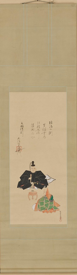 目を見開き正面を向く束帯姿の徳川家康は、東照大権現として神になった姿です。対面する僧侶は家康の死後、「権現」として祀ることを勧めた天海です。原本の賛は天海が記し、絵は狩野探幽が描きましたが、残念ながら戦災で焼失しました。