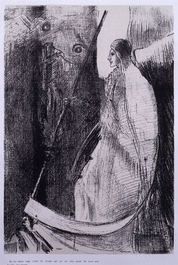 「地の穀物は全く実り、刈り取るべき時がきた」。デューラーでは「黙示録」第13場面の「七つの頭をもつ獣と小羊の角のある獣」において、画面上方中央に「白い雲」の上に座し「金の冠を被った人の子のような者」が、手に鋭い鎌を持って威厳のある姿を現わしている。続いてその鎌が大地に投下されるわけであるが、ルドンはさらにこれに続く場面を選択した。天使は童話に登場する魔法使いのように、頭巾を被り大地まで届く長い衣服を身に纏っている。背後には岩壁が切り立ら、その僅かばかりの裂け目から見える明るい空と重なるように、天使の横顔が描かれた。こうしたモティーフの扱いは、人物の印象をより一層鮮明に刻みつけるための周到な計算に基づくものであろう。天使は右手で大鎌の柄を持ち、ゆっくりと歩んでいる。デューラーでは小さな鎌の表現にされているが、ルドンはそれを巨大な鎌に代えることによって、画面を最も効果的に分割した。すなわち鎌の柄は、先にも述べたように、この版画集においてルドンが特に好んだ右上方から左下方へ向う斜線として描かれている。そのため、垂直線を基調とする諸形象が分断され、とりわけ単調な岩壁の形態モティーフに、造形的に面白味のある変化が与えられた。その上、鎌の刃の部分が人物の背中の線に繋がるように大きく円弧を描いているため、鎌の柄と刃、そして天使の身体が、画面中央に忘れがたい大きな三日月型の形態を生み出すことになった。また白い衣には、ルドンの本領である柔かい陰影ハッチングが用いられ、木炭素描がもつ優美な線的効果が、そのまま転写紙を介して画面上に刷り出された。ビザンチン風の8頭身の姿にされた天使は、神の刈取りの象徴図ともいうべき印象を示している。また背後の岩壁上に象験された不気味な二つの「眼」のモティーフの扱いは、周囲の岩肌の表現と相まって、エルンスト風のフロッタージュを見るような幻想喚起的表現にされた。さらに天使の持つ鎌の大きな刃が、後年の未来派において用いられた表現法に似て、幾本かの輪郭線によって数枚の刃があるように描かれているため、大鎌は時間の推移と運動感を示す形象にされている。(中谷伸生)