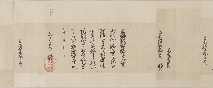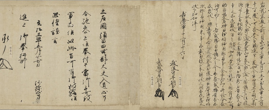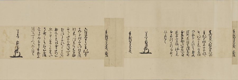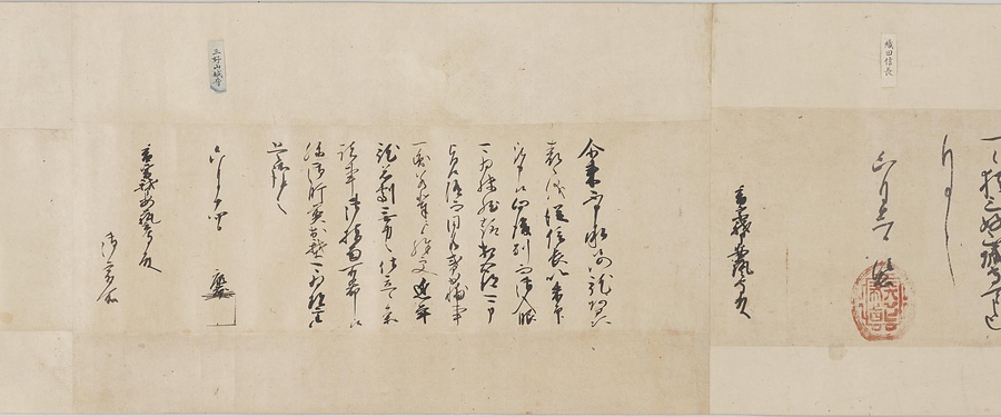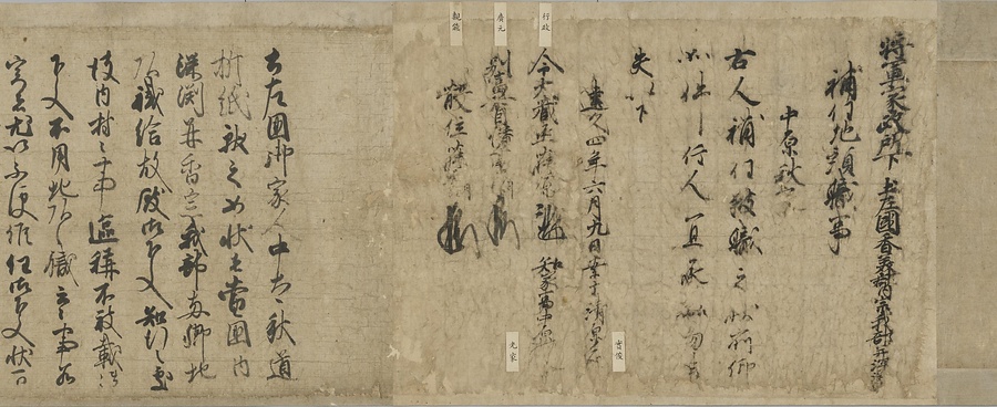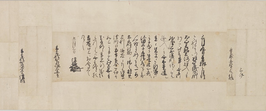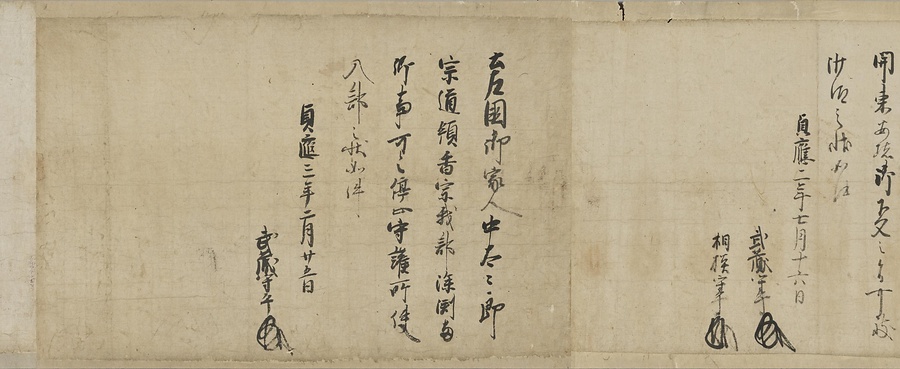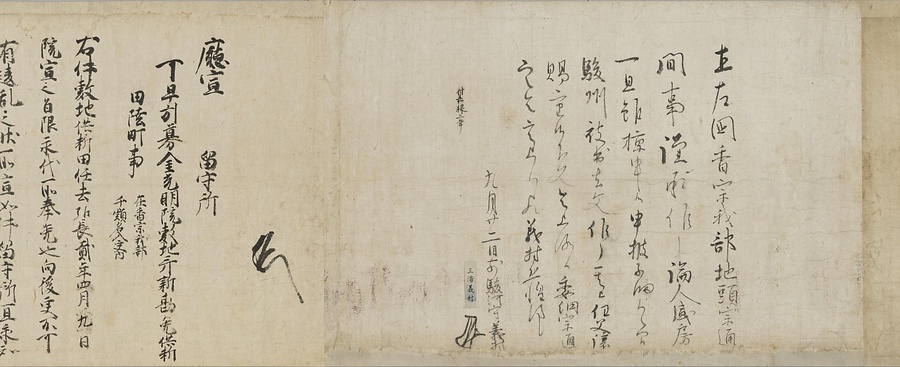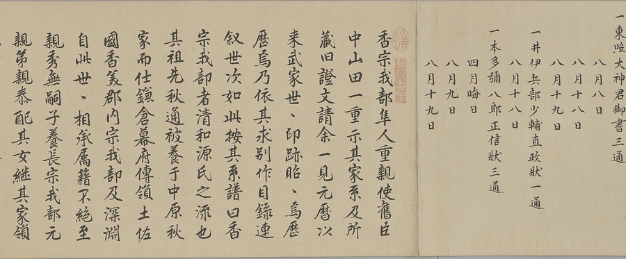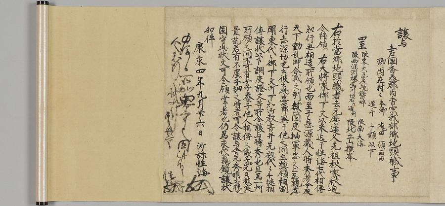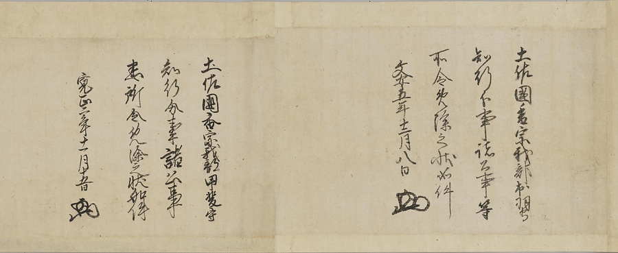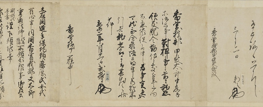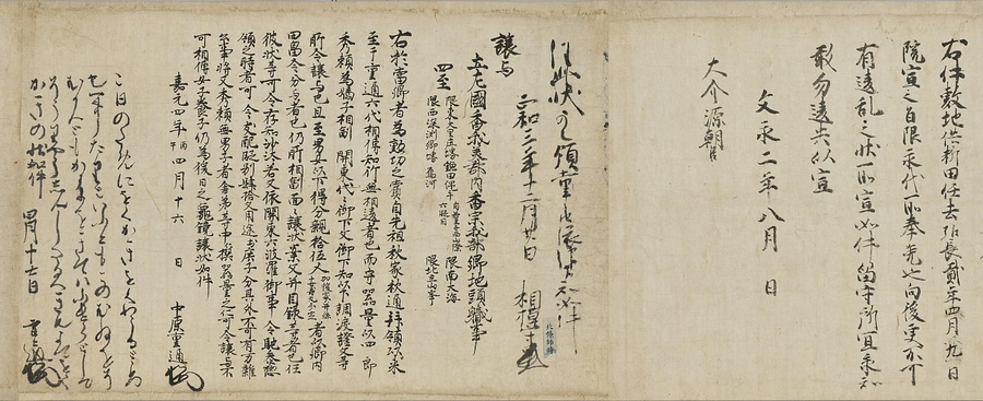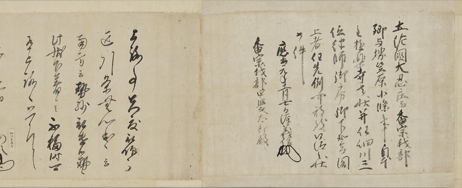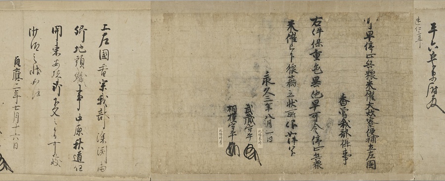 四国の武士香宗我部家に伝来した古文書群。巻第一は鎌倉時代で頼朝の下文(くだしぶみ)から始まり鎌倉幕府より所領の支配を認められた文書を中心に南北朝時代までの15通。巻第三は安土桃山時代で緊迫する大名間の駆け引きが生々しく知られる文書など20通からなる。