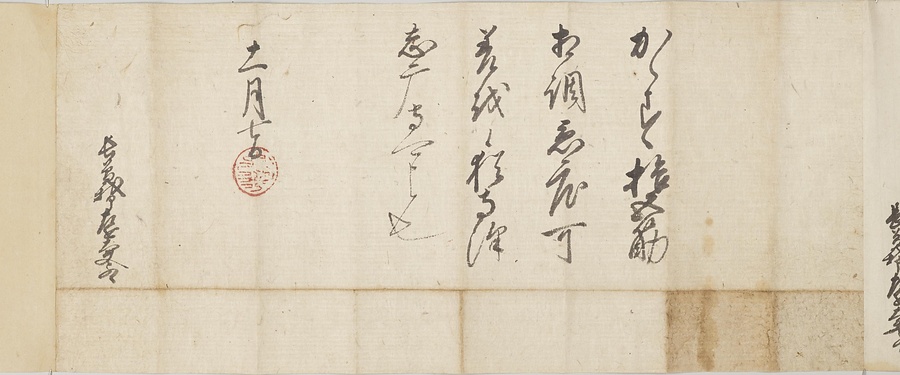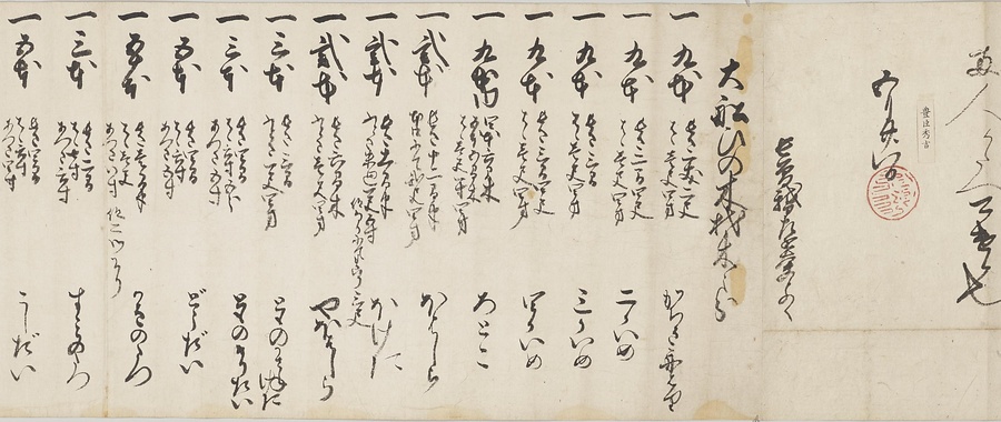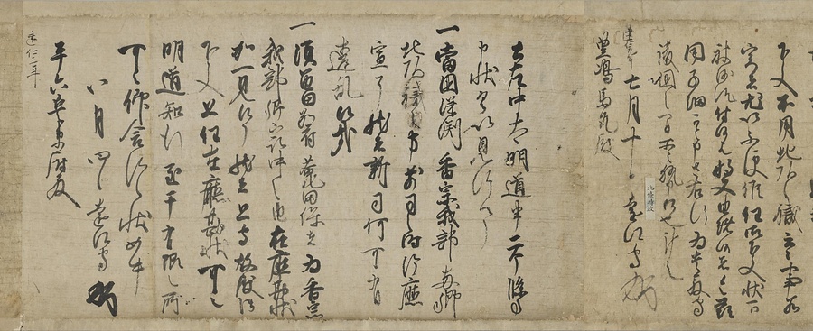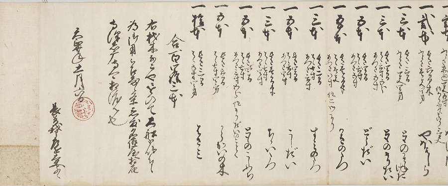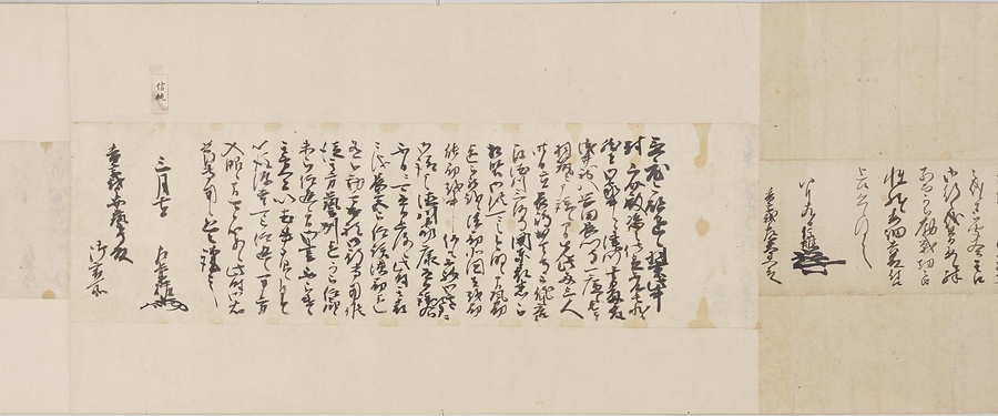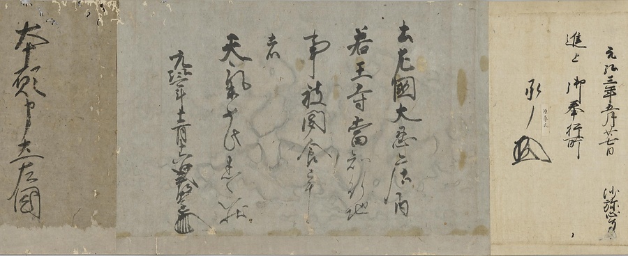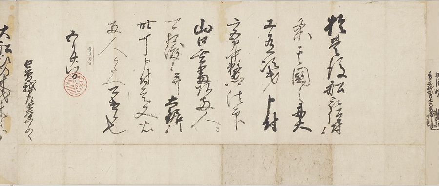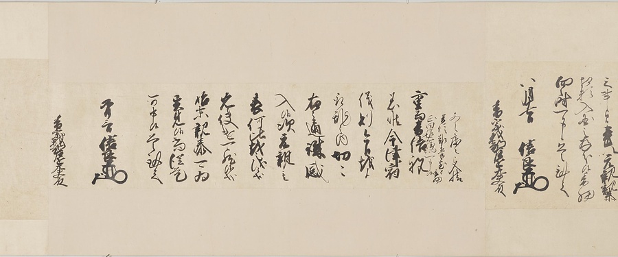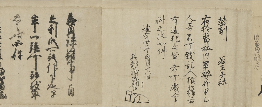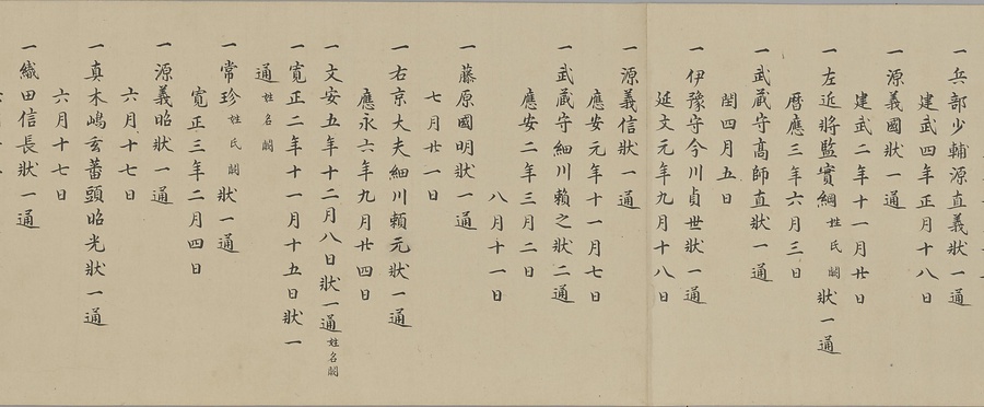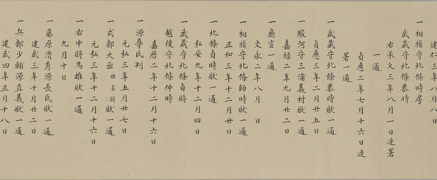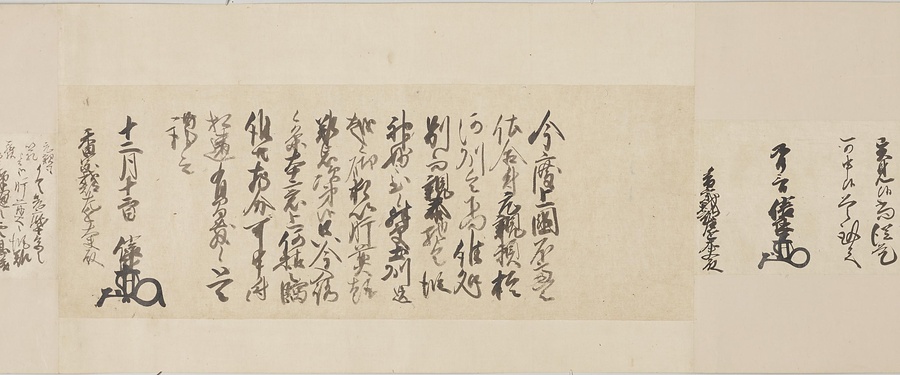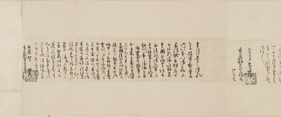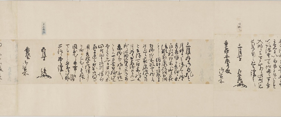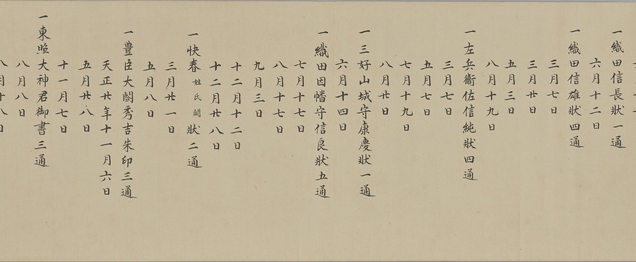 四国の武士香宗我部家に伝来した古文書群。巻第一は鎌倉時代で頼朝の下文(くだしぶみ)から始まり鎌倉幕府より所領の支配を認められた文書を中心に南北朝時代までの15通。巻第三は安土桃山時代で緊迫する大名間の駆け引きが生々しく知られる文書など20通からなる。