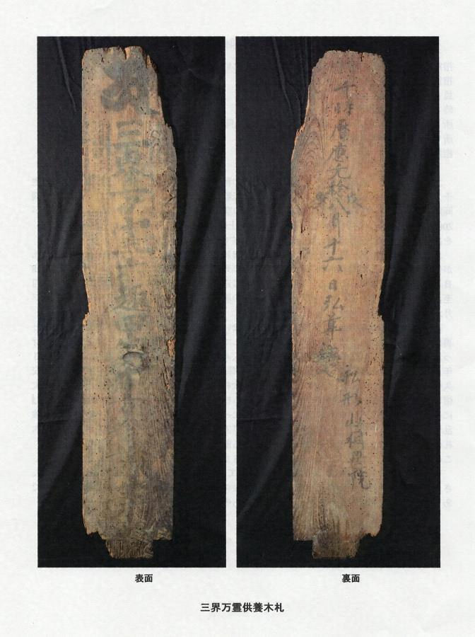 大型の木札で、表面の中央上部に大日如来の種子を記し、その下に「三界万霊六趣四生十方含識等」と大書し、裏面には「于時暦応元稔戊寅八月十六日、弘尊記之」「船形山桐岡院」とみえる。さらに表面中央墨書の左右の空白部分に、16世紀を中心とする人物名が200名近く追加記入されている。
