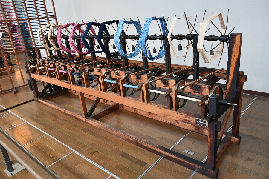 綛に巻かれた糸を木管に巻き取り管糸にする機械。織物のたて糸の柄に合わせて、木管に色糸を巻き取ります。