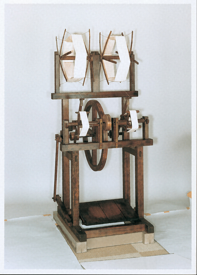 糸繰返機は、織機にかけるたて糸を準備するための機械で、かせ糸を1本1本糸枠に巻き取ります。従来は手回しで、1本ずつに巻いていましたが、豊田佐吉は多数の糸枠を各個自在に掛け外しできるように発明し、足踏みや動力で運転するようにしました。1人で同時に10数本巻き取り、生産性を画期的に向上させ、日本の織布業の発展に貢献しました。