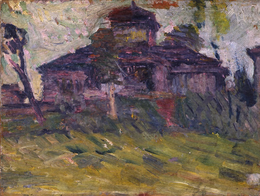 下部の草むら、建物、空はそれぞれ、白および他の区画の色によってつながりあいながら、互いが互いを浮かびあがらせている。もっとも勢いが強く、色もあざやかな草の黄緑は、斜めの筆致を連ねて、空間を宙にもちあげる。