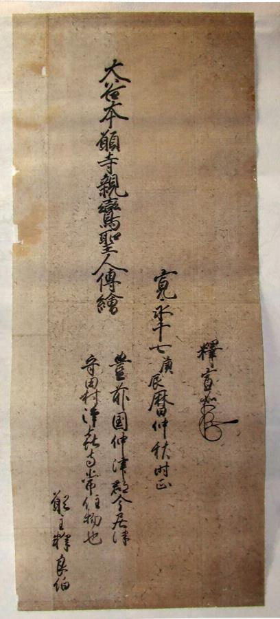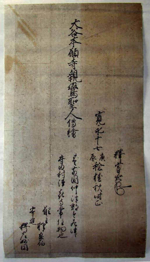 裏書より、寛永17年(1640)に浄喜寺の常住物として良伯(浄喜寺第六世住職の弟。一時第六世の代務者を務めた)が願主となって調えたものだとわかる。四幅とも東本願寺第十三世宣如の名と花押が見え、第三幅には釈尼妙円なる寄進者名も見える。