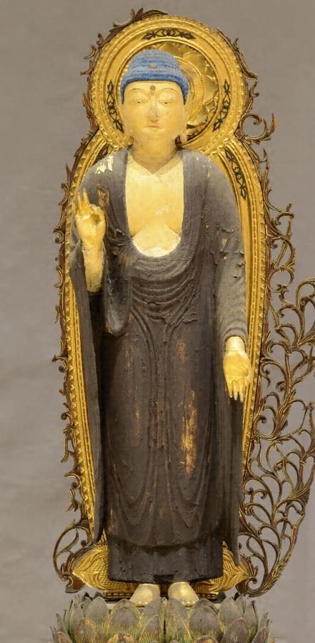 右手を胸前に置き、左手を垂下させ、ともに掌を正面に向けて第一指と第二指を捻じる来迎印を結び、踏み割りの蓮華座に立つ。肉髻・地髪部ともに螺髪を彫出し、肉髻珠をあらわす。顔は丸顔で、眉を墨書きする。眉間には白毫相をあらわす。両目は彫眼とし、瞳の周りに朱、白、灰色を置く。鼻は丸みを帯び、鼻孔をつくる。唇に朱を置く。耳垂部環状、貫通。三道相をあらわす。上半身に覆肩衣を着け、下半身に裙を履き、その上から袈裟を偏袒右肩にまとう。光背は舟形で、頭光と身光の周りに唐草の透かし彫り(欠損多し)を配し、台座は蓮華座、框座は八角形、蓮肉部は踏み割り形とする。