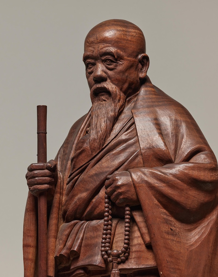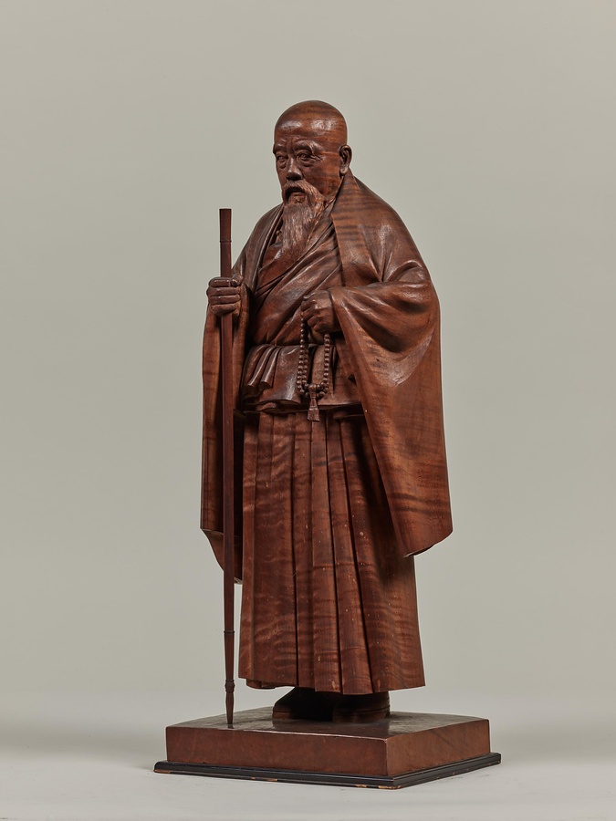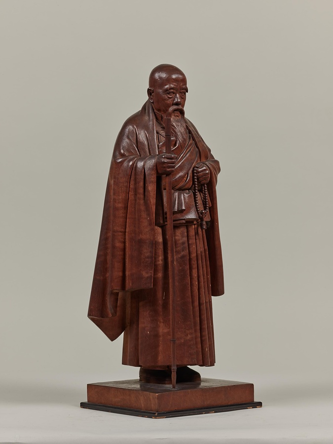 杖をついて立つ老僧の姿ながら、着衣を通してなおたくましい体つきを示し、2度にわたりチベットを旅した慧海の面影を伝えます。台座背面に「昭和十年四月光田謹写」と刻まれており、昭和11年の改組第1回帝展に出品された作品(東洋文庫所蔵)の試作とみられます。