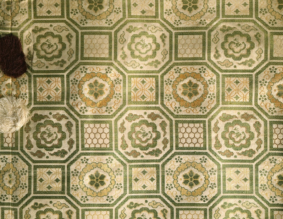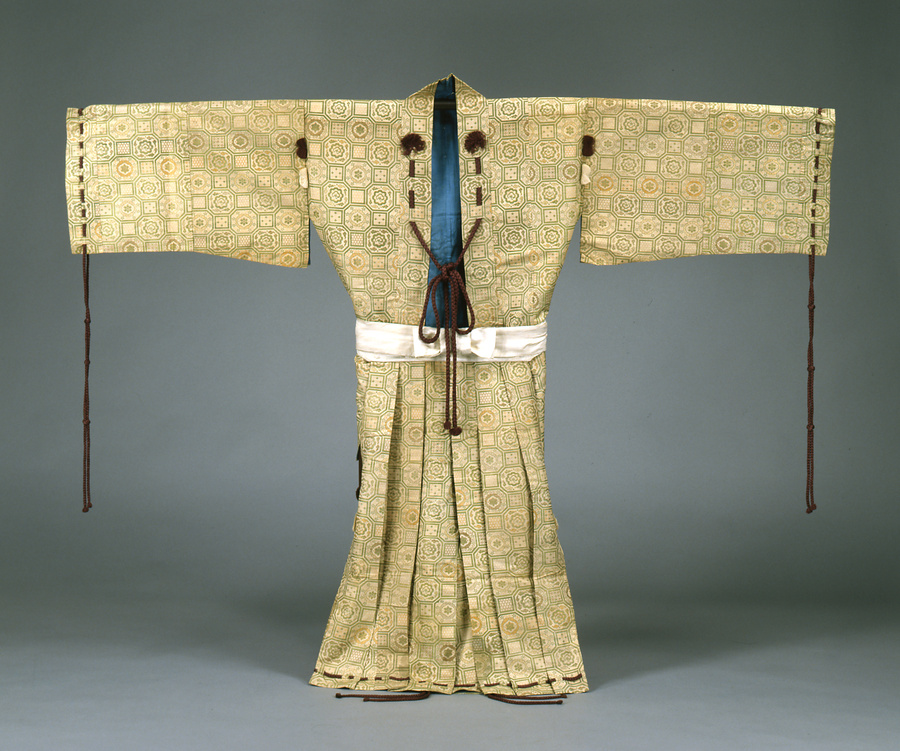 武将が鎧の下に着る鎧直垂。表地は八角形と正方形がつながり無限に広がっていく蜀江文を織り出している。蜀江文は中国・明時代に盛んに織られ、日本では宇宙観を表わす模様とみなされた。格調高い蜀江文錦の鎧直垂には武将の誇りが感じられる。