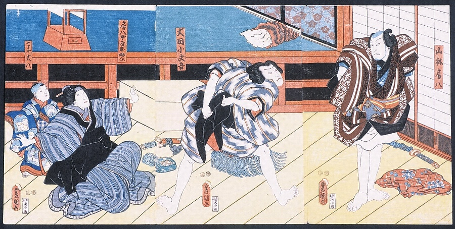 役者絵。嘉永5年(1852)市村座上演の際のものか。行徳古那屋で山林房八と小文吾が決闘をする場面。戦いに巻き込まれる房八女房おぬいと一子大八を描く。