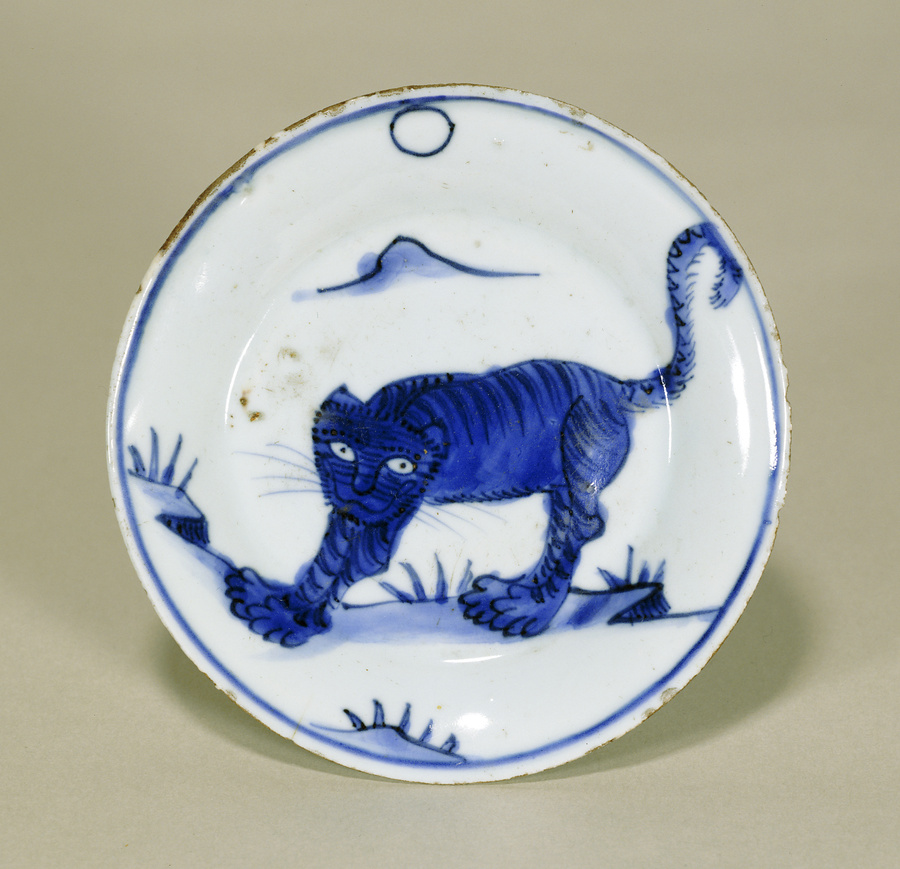 本作品は『甌香譜』に掲載されなかった虎の皿です。『甌香譜』刊行直後の昭和7年(1932)第1回の寄贈で博物館に収められました。一方、パネルの『甌香譜』二十六番「明天啓赤絵虎中皿」は5年後の昭和12年第2回の寄贈で列品に加えられています(TG-1394)。