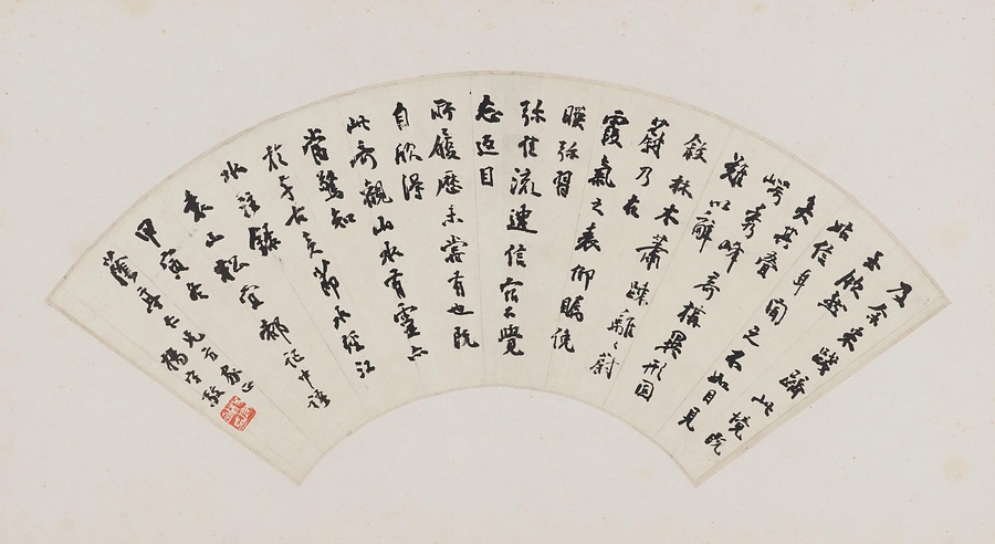 楊守敬(字惺吾@せいご@、号隣蘇@りんそ@老人)は地理学や金石@きんせき@学、碑帖@ひじょう@などにも精通した清末民国初期の学者。来日して日本の文人とも交遊し、明治期の書道史に影響を与えました。本作は中国の河川に関する地理書『水経注』巻34の江水@こうすい@(長江)に関する注の一節を書写した扇面。金石文のような蒼古@そうこ@とした趣のある字姿です。