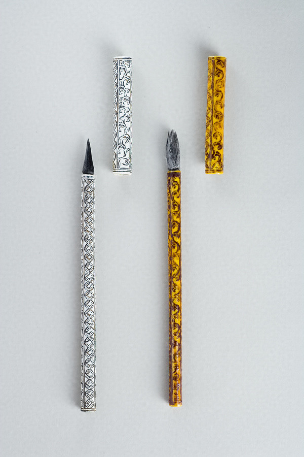 日展で活躍した篆刻家、加藤紫山の作による陶製の筆管。陶磁による文房具制作は、陶芸家の余技でなされることが多いが、篆刻という書芸術に通じた紫山の作は、書人の好みをよくとらえ繊細で精巧なものである。唐草と七宝模様を交互に配した同じ文様が、色違いの描き落とし技法で描かれている。鳥の羽毛で製した穂首が配され、軽やかな趣を添えている。