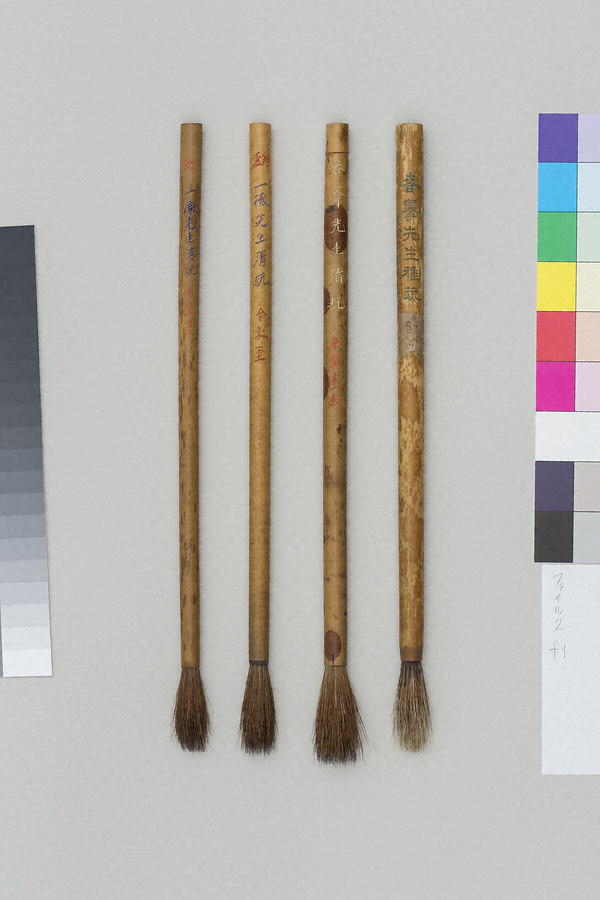 山元春挙(一八七一~一九三三)は、明治末期から昭和初期にかけて京都で活躍した日本画家。「松、薔薇、岩、濤」を得意として名を馳せた。両端の筆は京都の絵筆専門の老舗、金翠堂の製。「一徹」とは春挙の別号「一徹居士」に由来する。どちらも長鋒の兼毫筆であり、闊達な筆さばきを見せる春挙の画風は、このような筆に支えられたものであったことを知ることができる。中央の筆は、静岡の筆匠、円健斎の製で、華やかな火紋竹に彫り込まれた銘「壬戌春」から、大正一一年(一九二二)に制作されたものと知られる。本筆は、春挙畢生の大作「主基地方風俗歌屏風」の制作に使用されたという由緒を持つ。