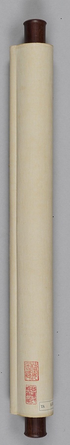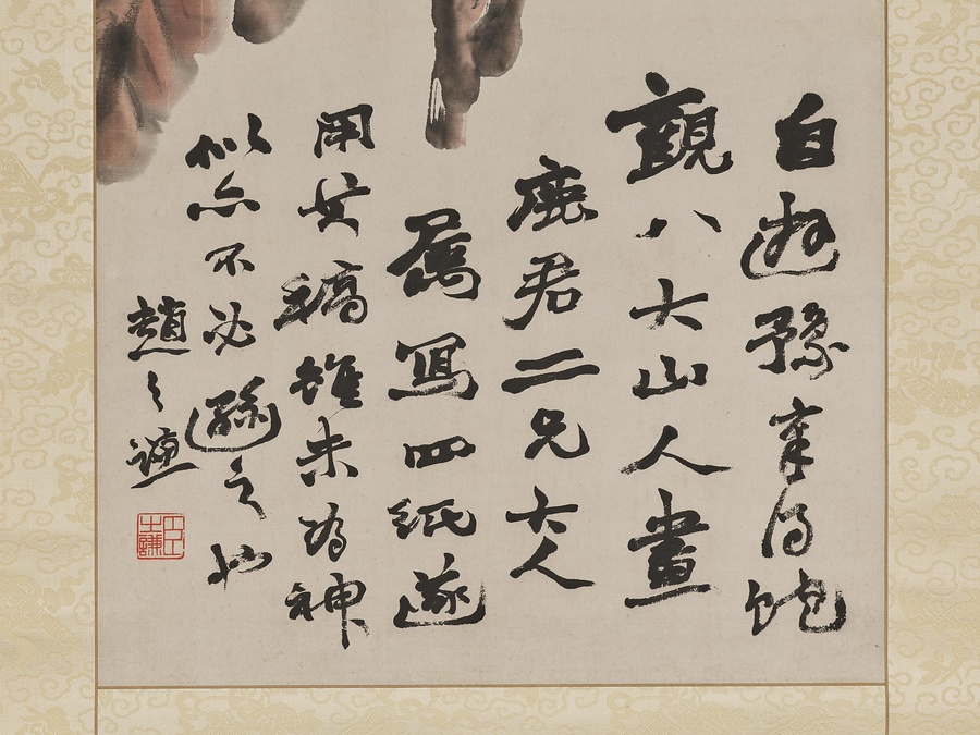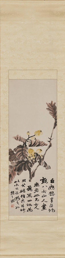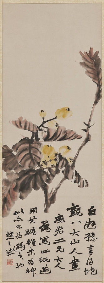 江西省南昌の出身である明末清初の遺民画家、朱耷(しゅとう)(八大山人)に倣った枇杷の図である。画賛に言うように、多くの朱耷の画を目にしたのは、江西省を拠点とした晩年のことであろう。本来は四屏として描かれ、本図はその第4幅目にあたる。
