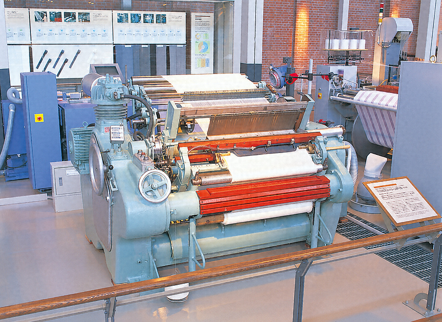 展示機は、スペインのサマラ社製で1974年に製造され、スエーデンのマクスボ社が1958年に世界で初めて実用化したエアジェット織機と同型の織機です。