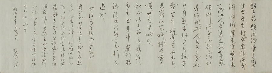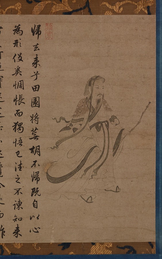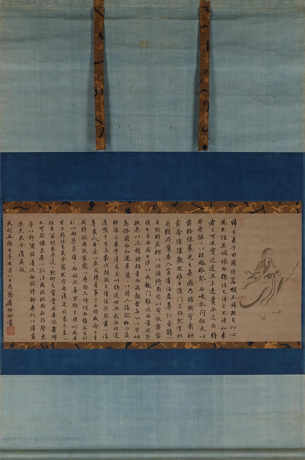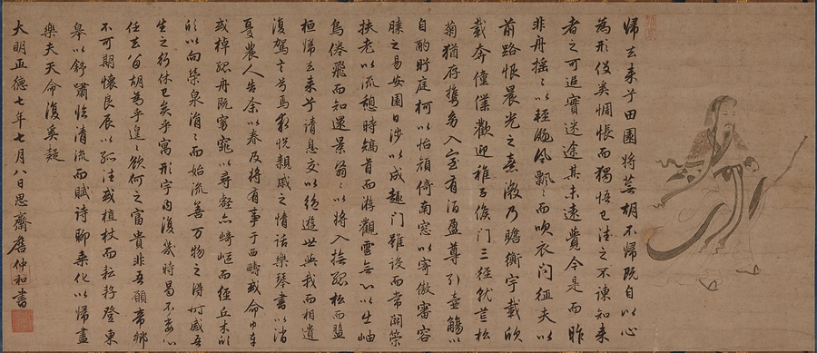 詹仲和は寧波@ニンポー@・杭州@こうしゅう@(浙江省)で活躍した書画家で、日本からの留学僧との交流も知られます。画は、北宋@ほくそう@の李公麟@りこうりん@が復興したという白描@はくびょう@(彩色をあまり用いず墨線の美しさを追及する画法)を得意としました。本作では、田園詩人として著名な陶淵明を流麗な墨線で描き、その「帰去来辞@ききょらいのじ@」を揮毫しています。