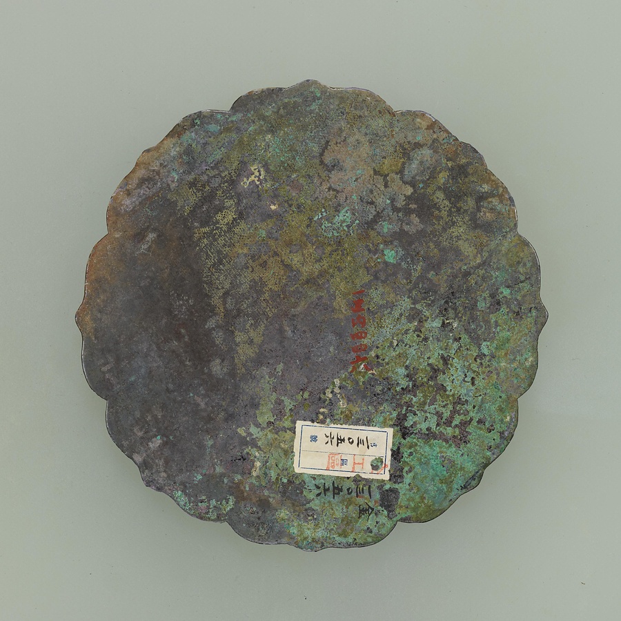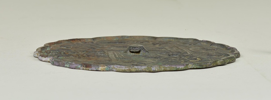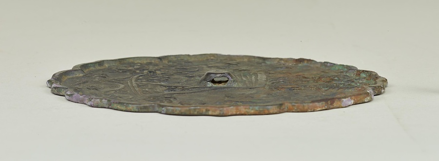 中国の宋【そう】時代や金【きん】時代に見られる鏡で、高麗でも好まれました。平行線な曲で立体的に表された波をかき分け、大勢の人々を乗せた船が進んでいますが、行く手には龍が出現するという場面です。この図像が何を表すのか、わかっていません。