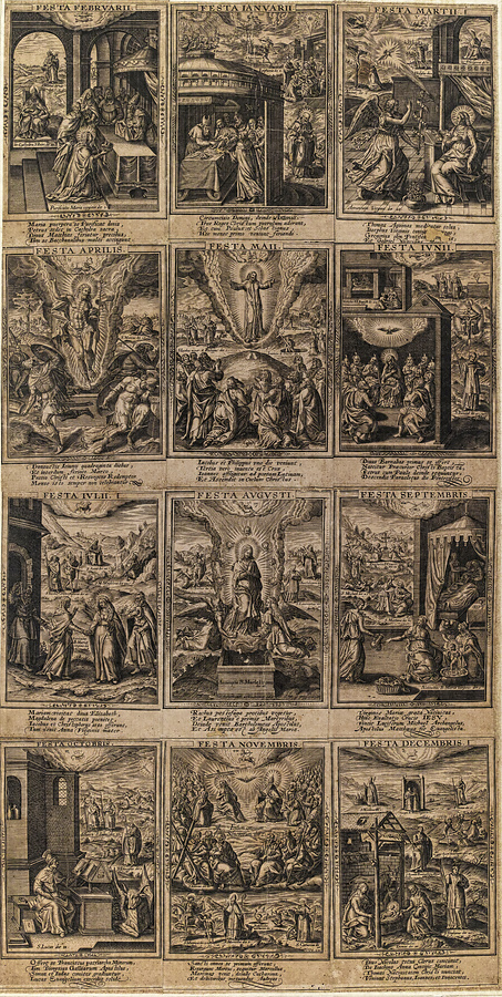 「1月キリストの割礼」「2月聖母マリアの神殿奉献」「3月受胎告知」「4月復活祭」「5月昇天祭」「6月聖霊降臨祭」「7月聖母マリアのエリサベツ訪問」「8月聖母被昇天」「9月聖母生誕」「10月聖ルカの祝日」「11月諸聖人の祝日」「12月キリスト降誕祭」を主に、他の聖人の祝日も描かれています。