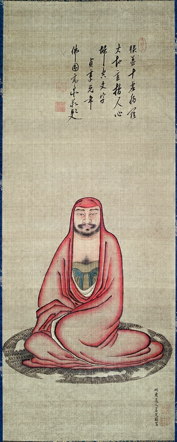 蘭溪若芝(1638-1707)は肥前佐賀の戦国大名・龍造寺家出身と伝えられます。俗姓は河村、僧名は蘭溪道光。長崎で逸然に画を学び、濃密な色彩と奇矯な造形美の道釈人物画を主に描きました。腐食象嵌による刀鍔装飾も学び、若芝を名乗る鍔細工師は幕末まで続いています。本図は濃墨の衣文線と淡い肉身の対比、姿態など、逸然の達磨図に基づくことがわかります。一方で、朱衣をまとい、端正な相貌を野卑な相貌へ、草座を穴あきの藁座へ、柔らかく流麗な衣文線を硬質な線へと変えて、奇矯さを増す姿へと変容しています。太い鼻筋、大きく見える鼻穴、横長でぎろりとした目、濃密な色彩、虫食いのような藁座の穴も若芝らしい奇矯な表現です。