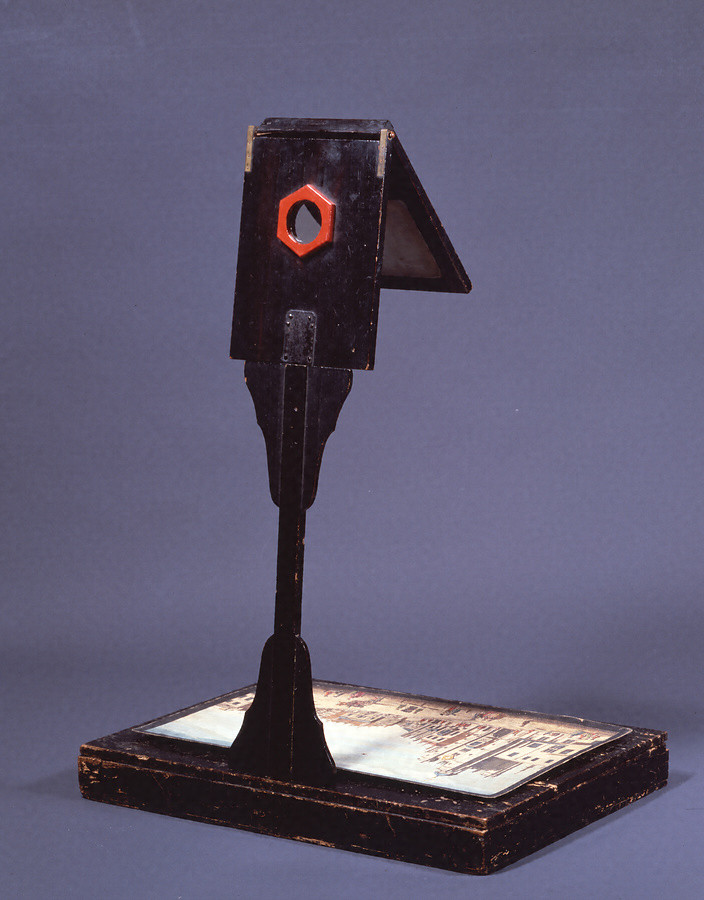 江漢による一連の銅板眼鏡絵のために作られたと考えられます。絵を水平に置き、支柱の上端につけた鏡とレンズで覗き見る仕組みです。分解して、台になる箱の中に部品を収納して持ち運ぶこともできます。箱の蓋裏には、眼鏡絵の鑑賞の仕方などを説明した引札が貼り付けてありあます。