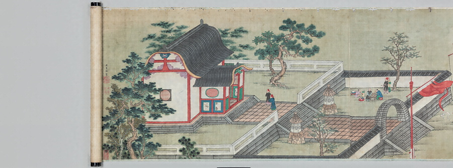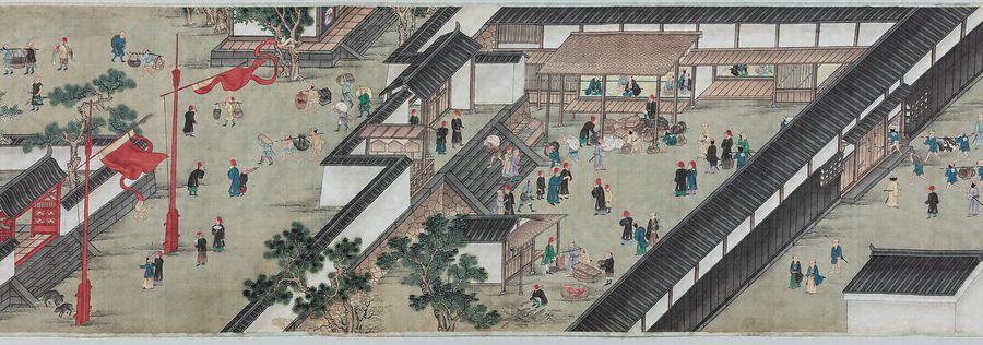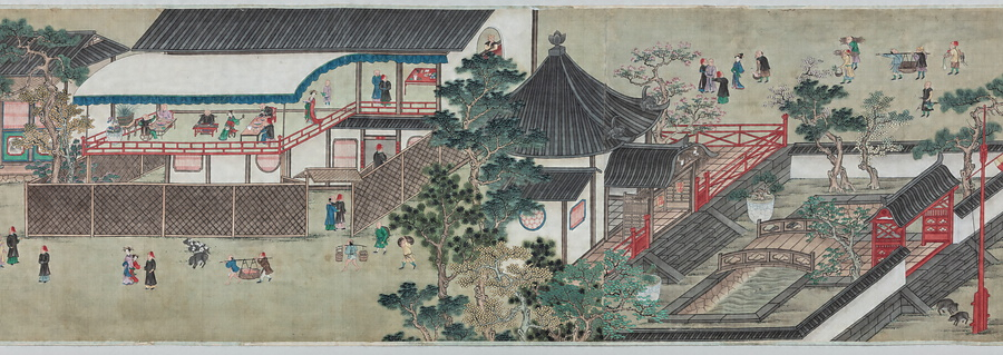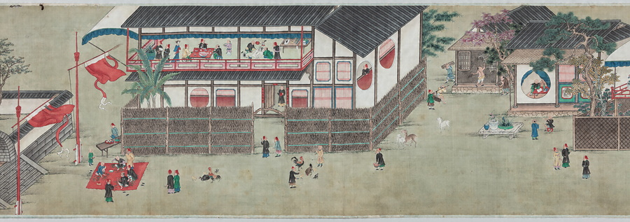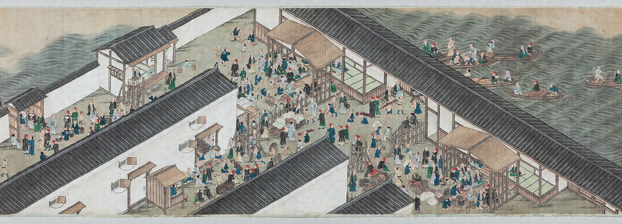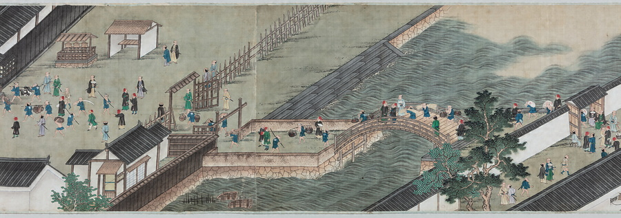明末清初の動乱期に日本に渡来した明の人たちは自分たちを唐人といいました。江戸時代、唐人という言葉は中国人を指す言葉として広く使われました。18世紀後半、大きく変化した唐人屋敷の景観を修正し、長崎貿易の詳細を視覚化するために、新たな「唐館図」が作成されました。本図は、渡辺秀石から数えて6代目の渡辺秀詮(1736-1824)の作品で、長崎奉行・中川忠英の旧蔵品。前半は中国船が入港して荷物を新地蔵所に荷揚げし、蔵に収める「丸荷役」の場面、後半は大門、二之門、土神堂、唐人部屋、天后堂の順に、唐館内の景観と風俗が濃密な色彩で精緻に描き出されています。