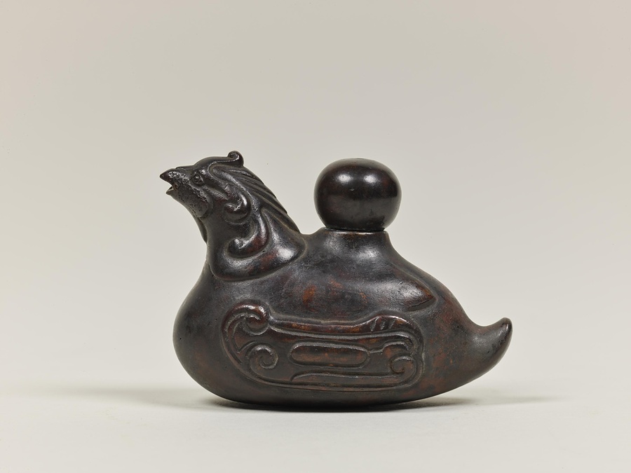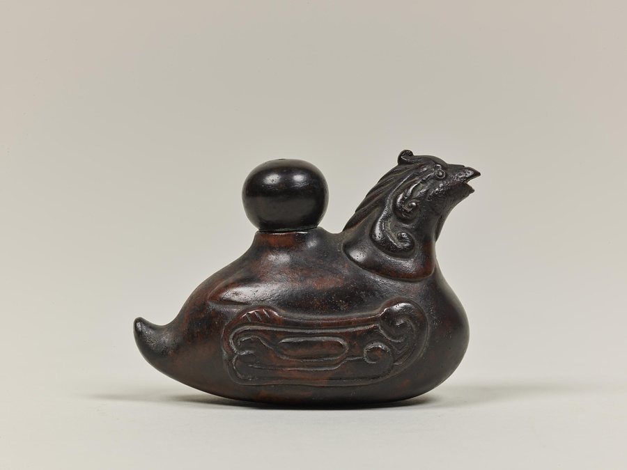 水滴は墨を擦【す】る際に硯【すずり】に注ぐ水を入れる容器です。江戸時代には蝋型鋳造法【ろうがたちゅうぞうほう】の発達もあり、動物、植物、人物など様々な形のものが作られました。本品はずんぐりとしていますが、伝説上の瑞鳥である鳳凰【ほうおう】をかたどっており、背中には蓋を兼ねて別造した宝珠【ほうじゅ】を乗せていいます。