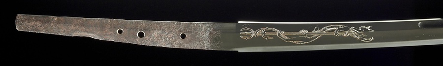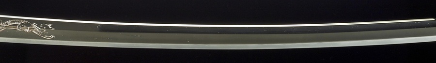 景光は、鎌倉時代末期に活躍した備前国(岡山県南東部)長船@おさふね@派の名工です。本品はその初期作で、父・長光@ながみつ@の晩年の作風を引き継いだものです。刀身はやや細身で、小板目@こいため@の精美な地鉄@じがね@に冴えた直刃@すぐは@を焼入れており、腰元@こしもと@の佩表@はきおもて@には俱利迦羅@くりから@、佩裏には梵字@ぼんじ@の彫物@ほりもの@があります。