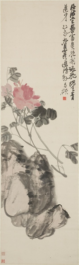 銘文:「酒満金罍富貴花開、詠花媿乏青蓮才、乙未九月写於遅鴻軒、昌碩」の款と「苦鉄不朽」(白文方印)がある。