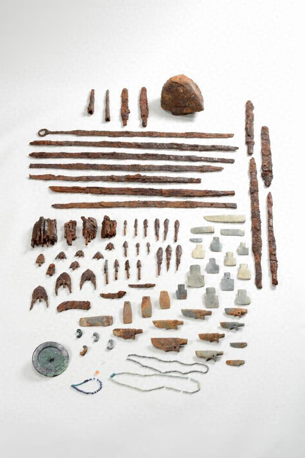 4基の埋葬施設から出土した副葬品の一括。大和政権から入手したと考えられる甲冑や刀剣類などの鉄製品が多量にあり、鉄製品を象った石製模造品も特徴的。古墳時代中期の東日本を代表する資料群であり、大和政権と東国の関係を考えるうえでも重要。
