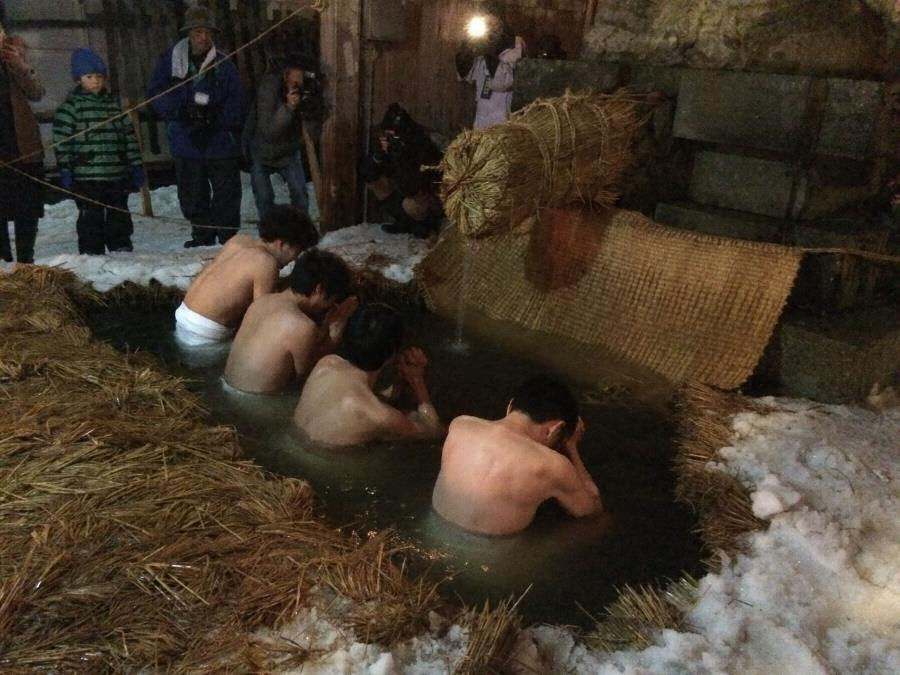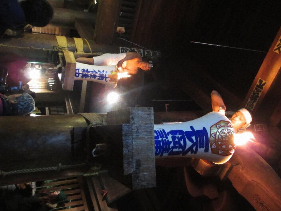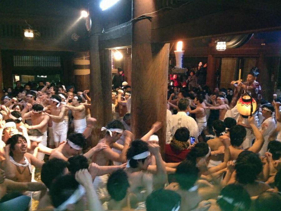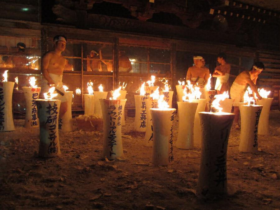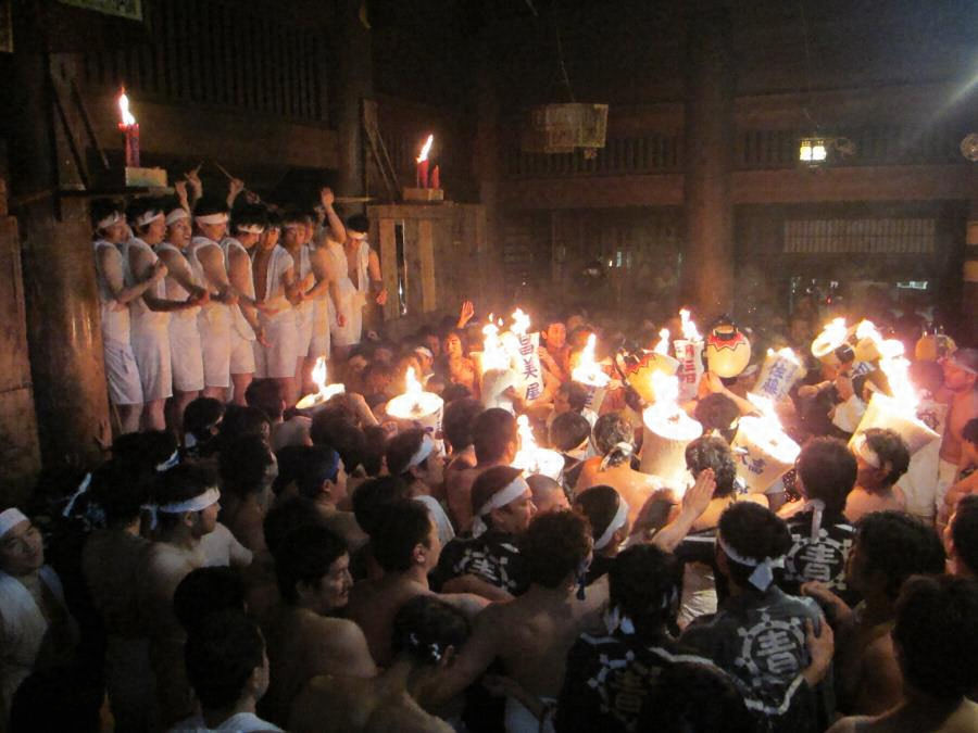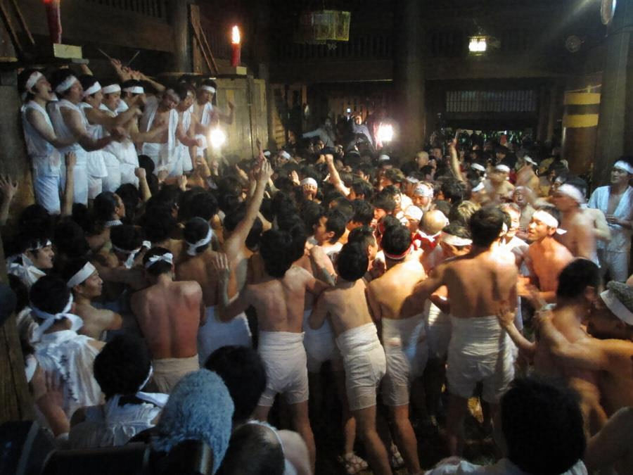 毘沙門天の信仰を支える講中も新潟県内を中心に各地にあり,行事に際して,大きなローソクや餅が奉納される。当日は,参加する男性の集団が夕方から境内で水行した後,毘沙門堂に参集し,毘沙門天を祀る内陣前で深夜まで押し合う。押合いの最中には,餅や盃等の福物の撒与があり,これを裸の男性たちが奪い合う。行事の最後には,年男をつとめる井口家の当主が青年団に肩車されて入堂し,五穀豊穣を祈願するササラスリが行われる。