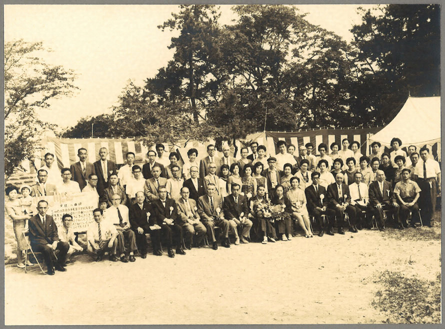本資料は、昭和41年(1966)に高岡古城公園小竹藪に建立された童謡「夕日」の曲碑除幕式の写真である。出席者の背後には垂れ幕が掛かり、写真左隅に見える「夕日」の曲碑が写るように、参列した大人62人と子供2人が並ぶ。最前列中央の花束を持つ男性は、童謡「夕日」の作曲者・室崎琴月であり、琴月から左に数えて2番目の人物が高岡市長を歴任し、名誉市民でもある堀健治(1907~89)である。ちなみに、本資料と同じ写真が、藤澤正美『ふるさとの誇り 高岡古城公園』(昭和63年)54頁に掲載されている(※3)。
