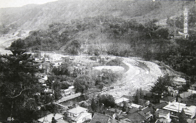 昭和初期の湯本温泉を、早川の上流側から撮影しています。湯場の対岸に広がる地域が、箱根湯本駅のある旭町です。こちらにも多くの建物が建ち並んでいます。