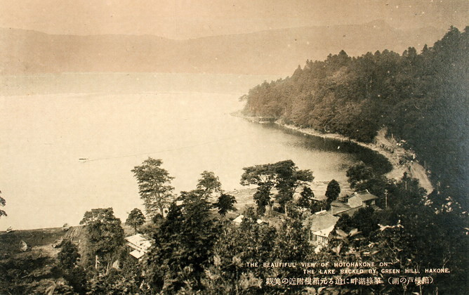 元箱根から箱根神社にかけての様子です。湖上には引き波を立てる船が見えますが、芦ノ湖にモーターボートが登場するのは、大正時代の中頃のことです。