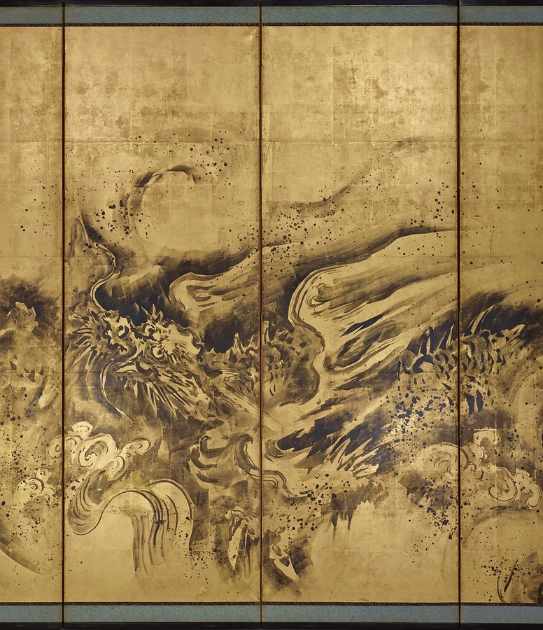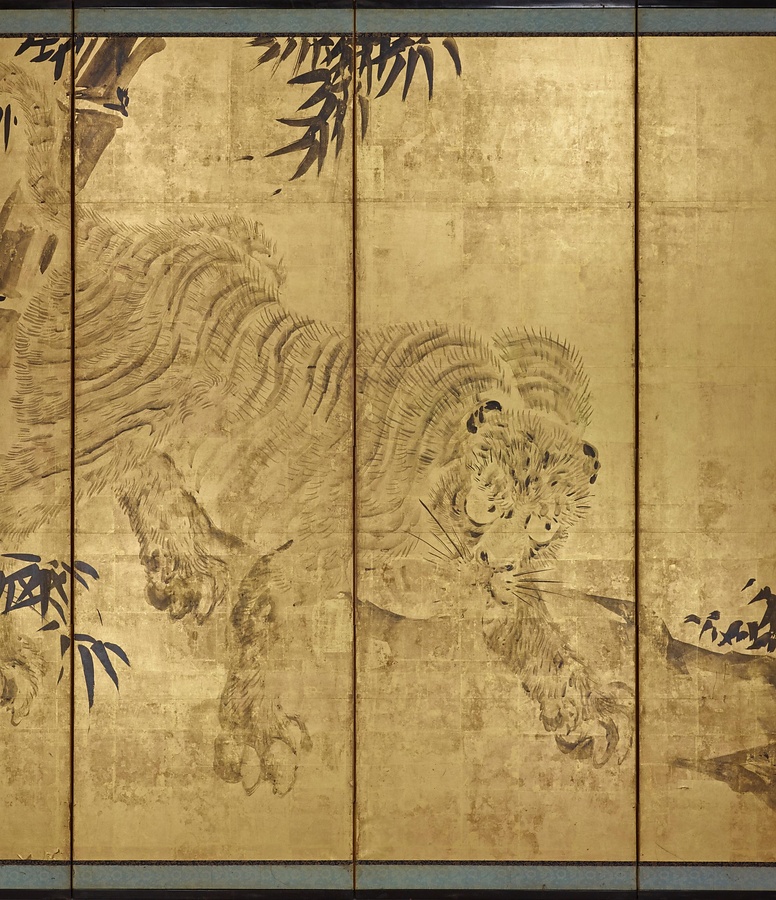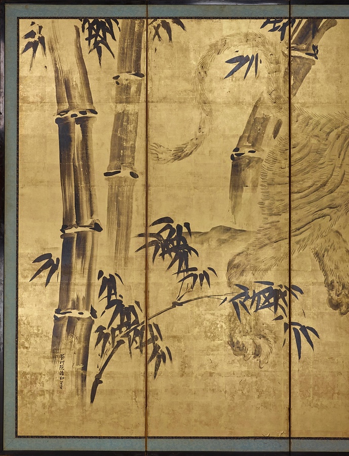 典信は幕府の御用をつとめた木挽町狩野家六代目当主。田沼意次+たぬまおきつぐ+や徳川家治+とくがわいえはる+に重用され、木挽町家が台頭する上で重要な役割を果たしました。新しいものを取り入れるとともに、狩野派元来の力強い表現を復興しました。本作でも伝統的な画題である龍虎を力強く描いています。