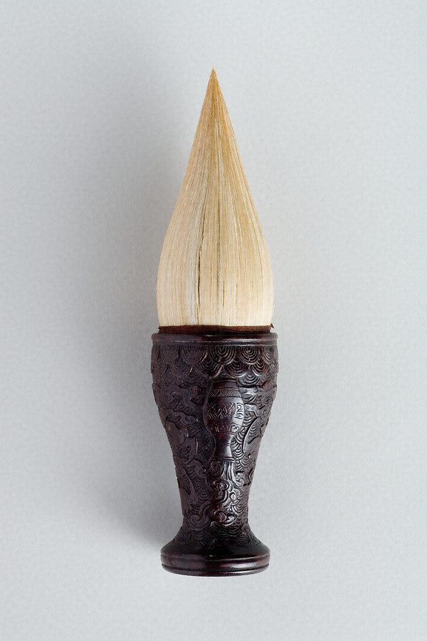 このような形の唐筆は、筆管が壷の形に似ていることから「壷筆」と呼ばれ、装飾を兼ねて机上に立てておけるために愛用されてきた。本筆に彫刻されている壺の中からは水があふれ出て、幾重にも重なる同心円状の波を示す「青海波」となって大海を暗示している。大海の広大さは、同様に果てを知らない芸術である「書」に例えられることがしばしばあり、この一本に秘められた意味は深い。