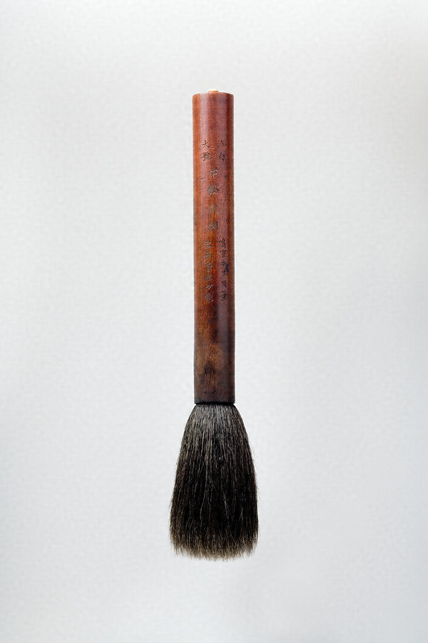 日下部鳴鶴(一八三八~一九二二)は中林梧竹、巌谷一六と共に「明治の三筆」と呼ばれる書家。門弟三千人に及んだといわれ、現代の書家の師承関係をたどれば日下部鳴鶴に行き着くことは多く、「日本近代書道の父」として尊ばれている。鳴鶴は明治十三年(一八八〇)に来日した楊守敬のもたらした長鋒の羊毫筆を好んで使用した。本筆は、東京、神田に今も盛業中の筆舗、温恭堂が製した長鋒の羊毫筆である。