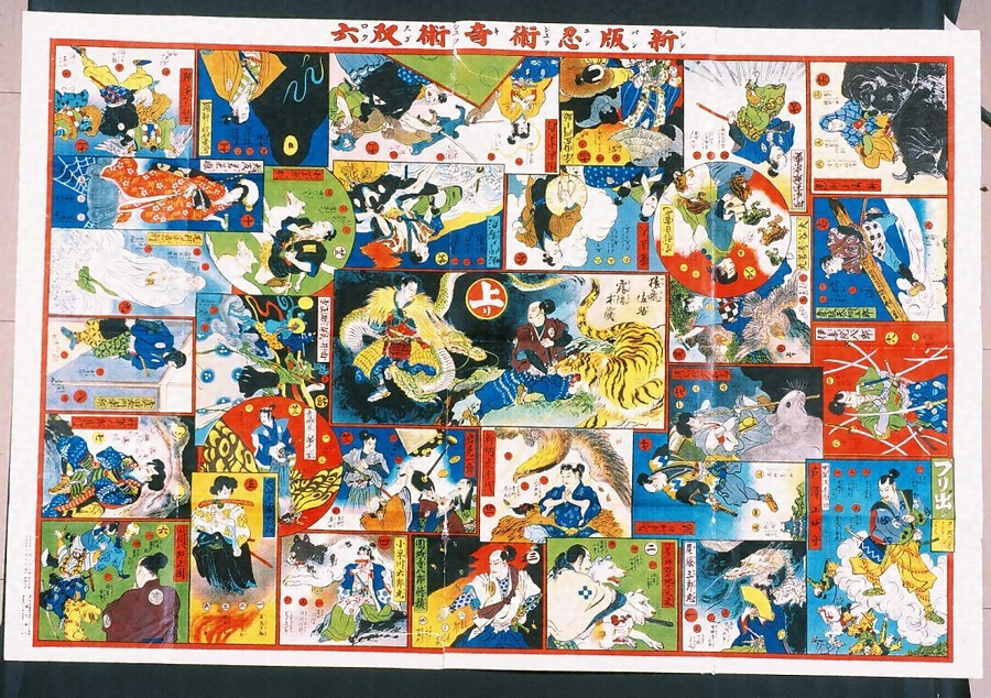 子供に人気の忍術使いを集めた双六。八犬伝の道節が描かれている。