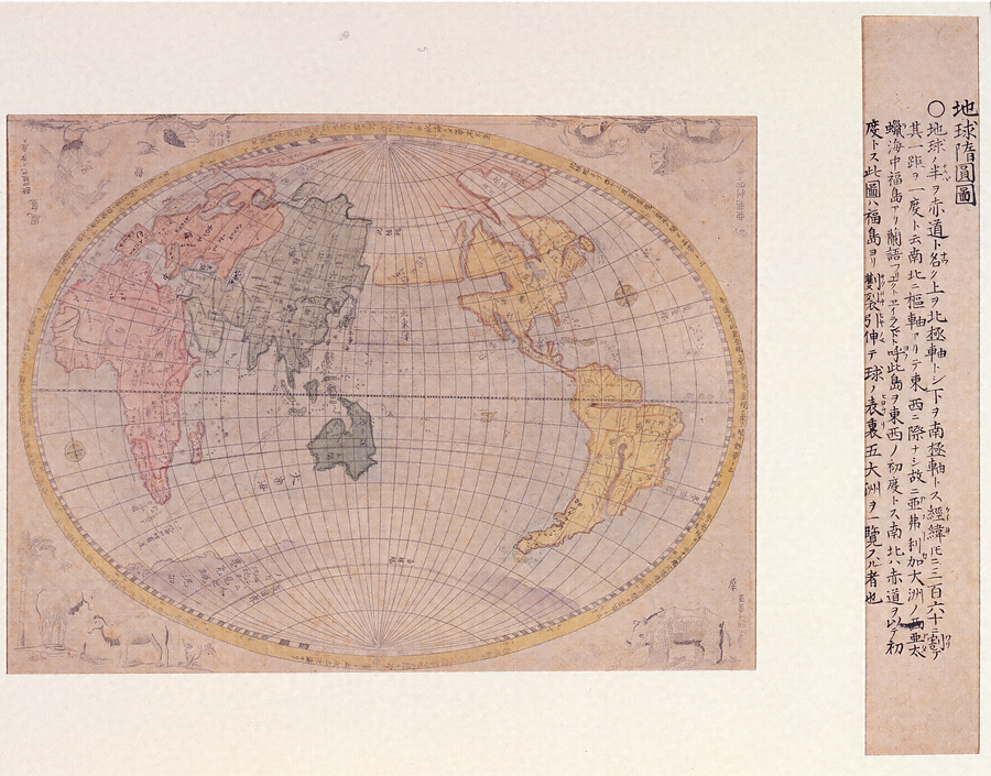 「地球楕円図」は全世界を正確な楕円の中に、しかも経線・緯線を曲線に描くなど、他に例のない図形となっています。江漢は寛政元年(1789)の長崎旅行の帰りに「楕円文廻し」を新製した大坂の間重富(1756-1816、家業は質屋ですが、天文家・暦算家としても知られる)と会っているので、彼に借りるか、参考にして自作した楕円用コンパスで本図を描いたことも考えられます。楕円外の四隅には『ヨンストン動物図譜』からとられたライオン・サイ・鳳凰・ドラゴン・駱駝の図があります。