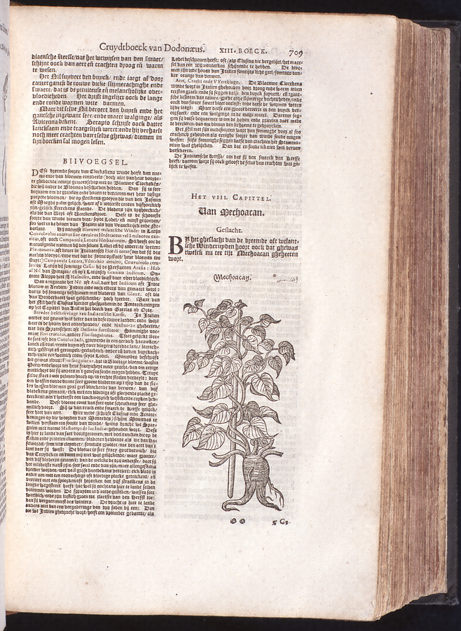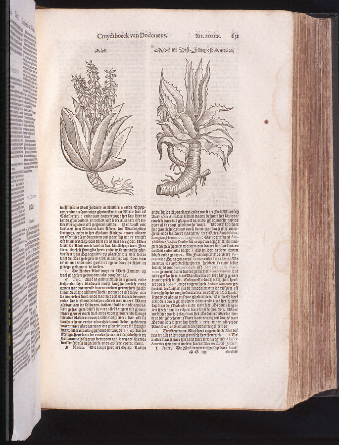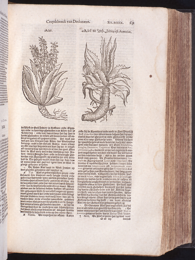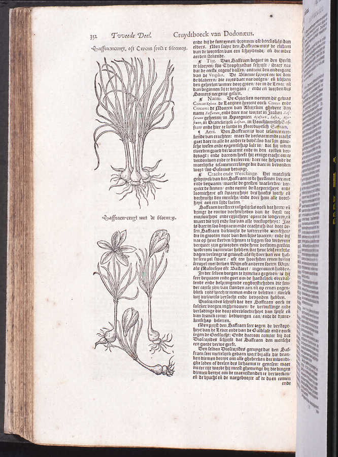 ドドネウス(1517〜85)はフランダース出身の医者・植物学者で、ライデン大学教授。本書は薬用植物を図入りで紹介し、その効用や性質について、解説を付しています。1554年に刊行されて各国で版を重ね、日本へもオランダ船によって持ち渡られました。江戸時代の蘭学者たちに最も親しまれた蘭書のひとつで、野呂元丈や大槻玄沢が翻訳・紹介を試みています。平賀源内も本書を入手し、自著『物類品隲』中に挿絵としてサフランの図を写しています。