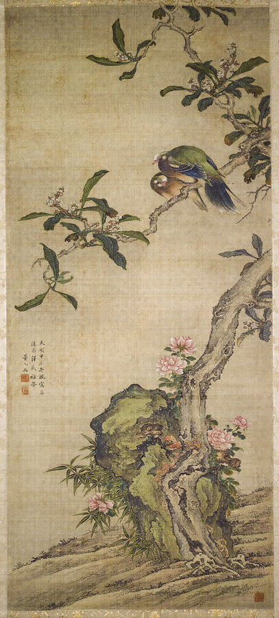 董九如(1745-1802)は宋紫石に学んだ絵師で、実は井戸弘梁という旗本。家禄は500石で西之丸御小姓組を勤めました。住居を黄蘆園と称したり、書画古器を多く収集するなど、かなり風流な生活をおくっていたようです。本図では、でっぷりとしたつがいのキンバトなど、宋紫石譲りのモチーフも見られますが、師の軽快且つ瀟洒な作風とは対照的に、細部描写の執拗さ、濃厚な色彩感覚、重々しい構図の安定感など、中国絵画に先祖帰りしたかのような雰囲気も併せ持ちます。江戸シノワズリーのひとつの極致ともいえる作品です。