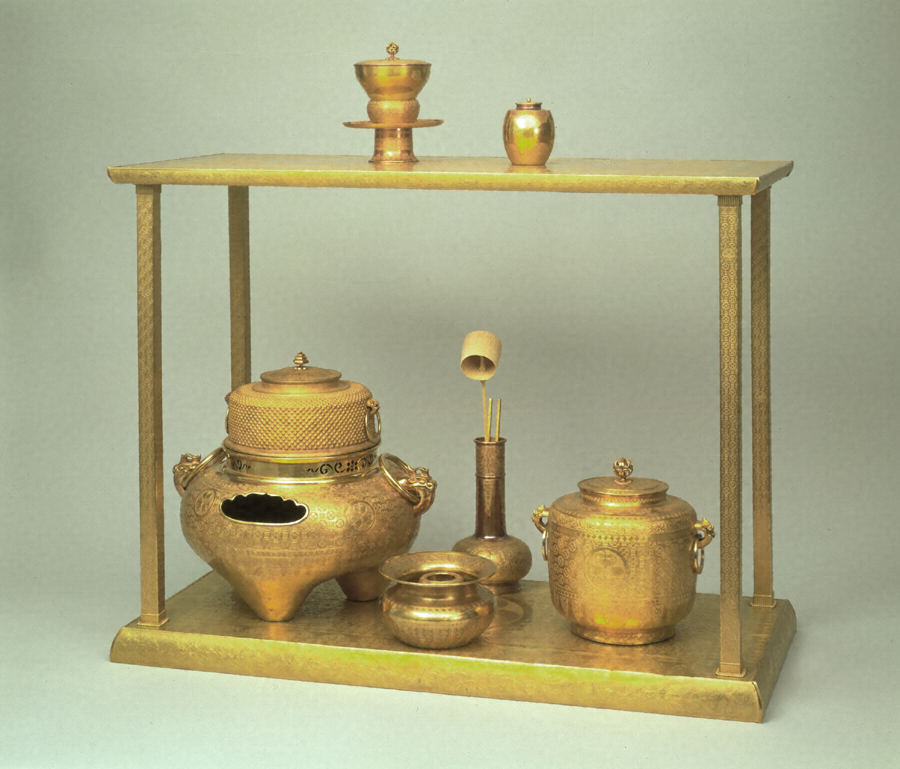三代将軍家光の娘で尾張二代光友夫人千代姫の婚礼調度の一つ。黄金の嫁入り道具は茶道具十一点、香道具十点、調度品六点、合計二十七点が現存する。当初は更に多量な黄金の嫁入り道具が用意されたとみられる。釜は三一四五グラム、風炉は七〇二〇グラムの重量である。他に台子・水指・建水・杓立・茶入・天目台・天目茶碗・棗・蓋置が揃っている。台子、天目茶碗は木胎を芯にして金の薄板を着せた構造であるが、他は無垢か薄板の貼り合せである。