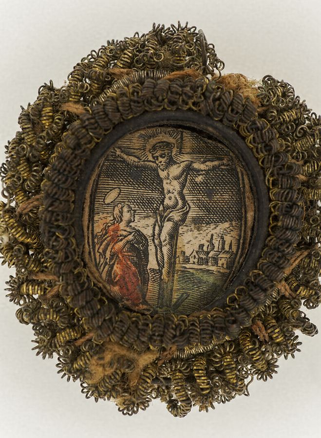 片面に神の子羊、片面にキリストの磔刑像を描いています。前者は本来旧約聖書の罪を贖うための生贄として描かれていましたが、本図のように旗を持つ子羊は、下に記された「IHS」と同様に、キリスト教の図像ではイエス・キリストの象徴となります。