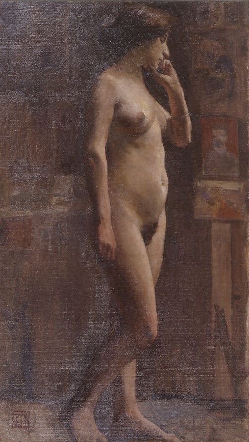 当時の日本の洋画界は、白馬会の中心人物、黒田清輝の明るい印象派風の外光派絵画が支配的であったが、不折はその流れに対抗して、鹿子木孟郎らが創設した太平洋画会に所属した。この会の作風は、不折の《裸婦立像》に見られる褐色調の暗い画面を特徴としていたことから、「脂(やに)派」と名づけられている。厳格なアカデミズムの作風は、しばしば形骸化した教科書版の様式に陥りがちである。しかし、不折の裸婦ではそうした弱点はあまり目立たず、むしろ嫌みのない清潔な特質が目立っている。
