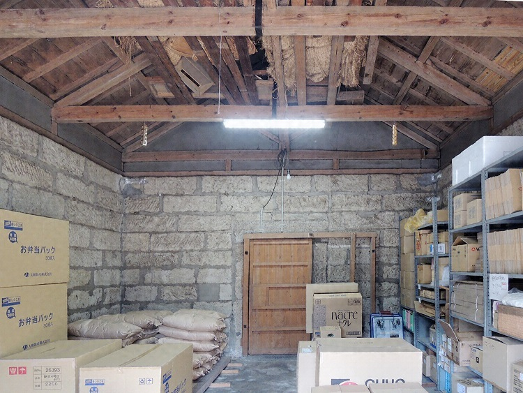 製造棟西棟の西側に南面して建つ。石蔵は切妻造鉄板葺妻入の平屋建で、背面に木造の豆小屋を附属する。大豆貯蔵庫の石蔵は外壁秋保石積の現し、トラス小屋組。計量作業場の豆小屋は外壁下見板張、和小屋である。納豆製造に欠かせない近代食品工場の附属施設。