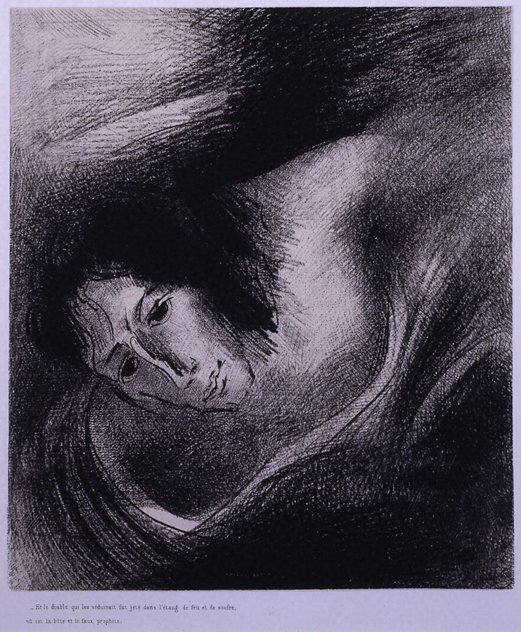 千年の期間が過ぎ去ると、悪魔は牢獄から解放され、「地の四万にいる諸国民」を惑わし、彼らを戦いのために召集して、「聖徒たちの陣営と愛されていた都」を包囲させた。「すると、天から火が下ってきて、彼らを焼き尽くした」のである。多くの民を惑わした悪魔は火と硫黄の池に投げ込まれ、「世々限りなく日夜」、苦しめられることになる。ルドンの描く悪魔は、堕ちて行くイメージで表現されているが、陰気で神経質そうに頗をしかめた表情には、再び地獄に突き落される苦痛の心情が反映させられたと解すべきであろうか。上半身のみを覗かせる悪魔は、激しい明暗の交替を示す渦巻く火と硫黄の池の中に身を沈め、いやおうなく奈落の底へ引きずり込まれて行く。画面では幾重にも重ねられたおびただしい陰影ハッチングによって、何段階もの明暗の調子が描き分けられ、その不安な動揺を示す肌理の細かい線の細工は、悪魔の腺病質な性格を一層際立たせる感がある。リチャード・ホップスは、左側に頭部を傾けた顔のモティーフが、先行する「聖アントワヌの誘惑」第三集第17場面に見られる悪魔の顔を再度採用したものであると指摘している。(中谷伸生)